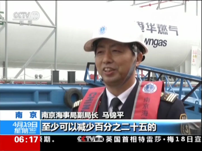 ????????2017年4月19日,中央電視臺新聞頻道朝聞天下欄目報道——江蘇海企港華燃氣股份有限公司自主建造的國內(nèi)最大水油氣加注躉船“海港星02”號即將在江蘇投運?!昂8坌?2”號加注躉船總投資約6100萬元,船長136米,配備2個250立方米的液化天然氣(LNG)儲罐和可儲存近2000噸柴油的油艙。
