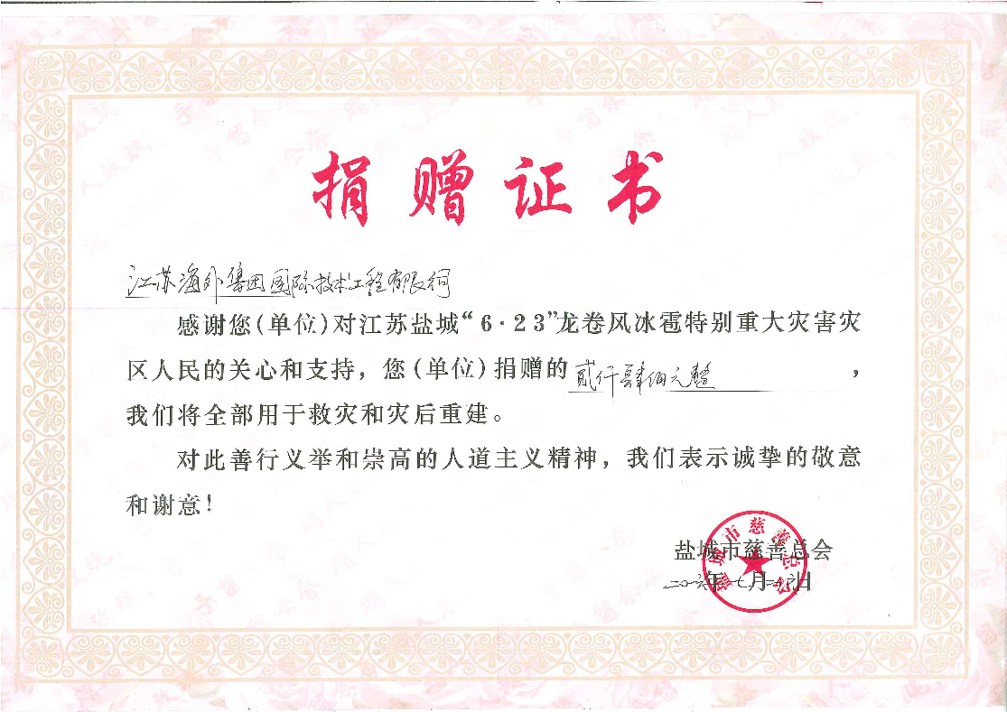 鹽城龍卷風(fēng)災(zāi)害捐贈證書